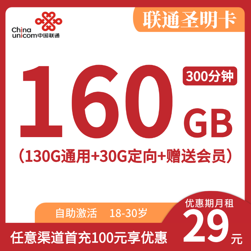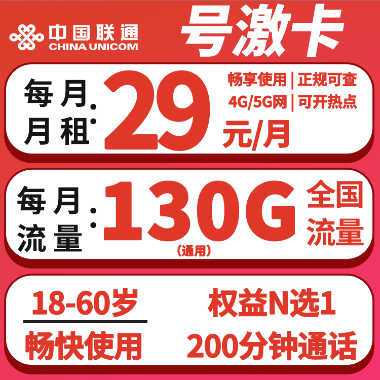 29元130G+200分钟+权益N选1(18-60岁)