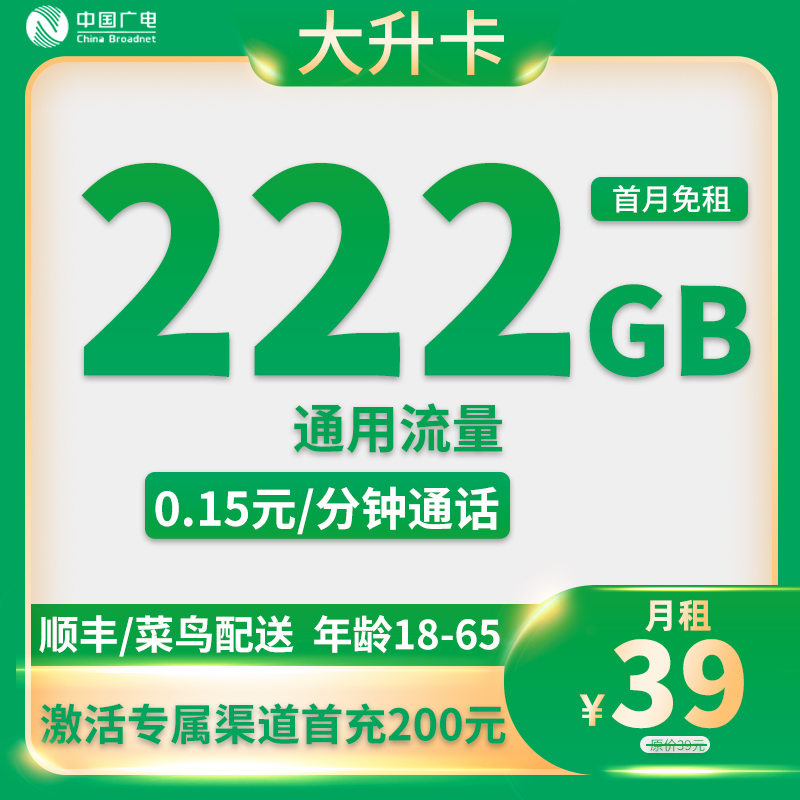 39元222G通用流量+0.15元/分钟通话【归属地即收货地】