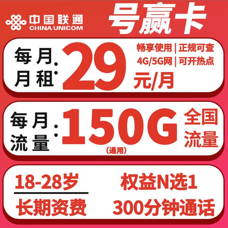 29元150G全国通用流量+300分钟+权益N选1(流量通话都是长期,18-28岁)
