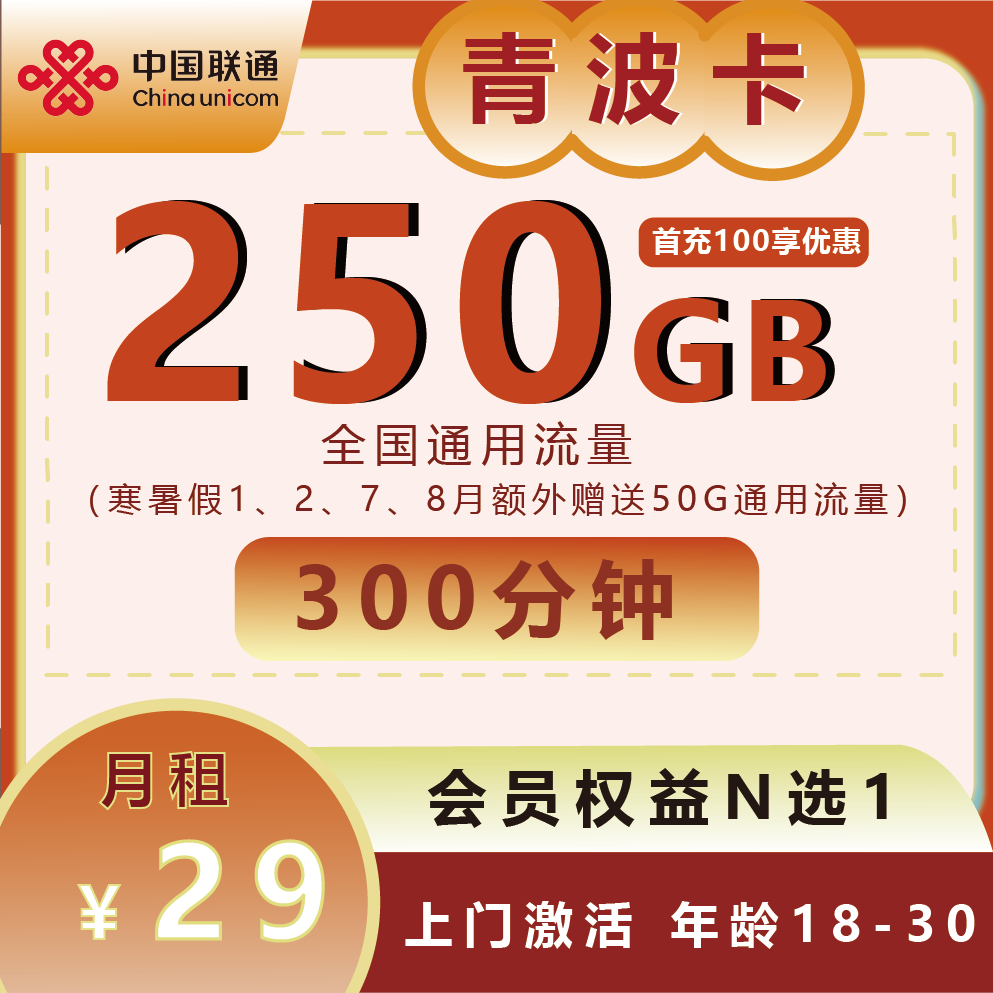 29元/月250G通用流量+300分钟通话+会员N选1(仅发四川)