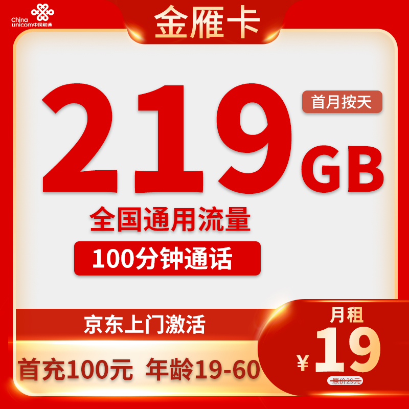 19+2元120G全国通用流量+100分钟通话(本地归属地)