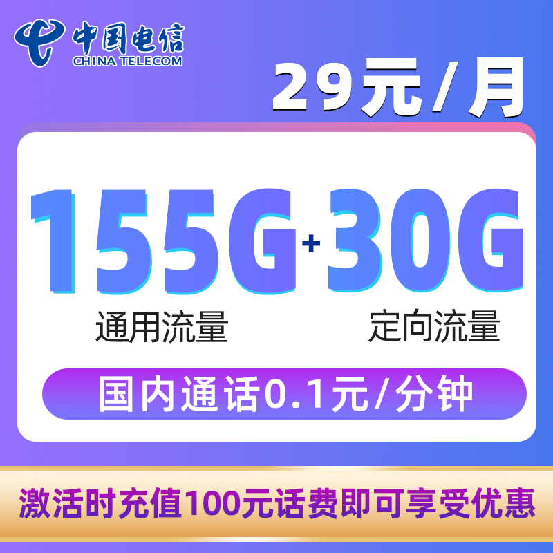 185G全国流量+100分钟(部分优惠激活30天后叠加)